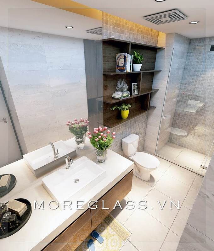 Phòng tắm hiện đại được thiết kế với những kệ tủ trang trí, tủ lavabo đơn giản nhưng hiện đại, cùng với các thiết bị vệ sinh và phòng tắm kính đẹp.