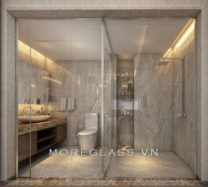 Mẫu thiết kế của nhà tắm và nhà vệ sinh sử dụng kính cường lực để tạo nên vẻ đẹp tinh tế và sang trọng.