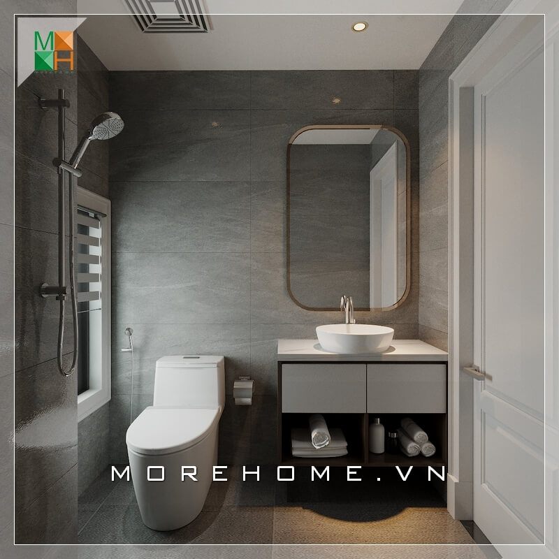 Mẫu thiết kế phòng vệ sinh hiện đại, có diện tích nhỏ gọn với các bố trí nội thất hợp lý, không gian được bố trí hài hòa và các ngăn nắp giúp tạo nên không gian thoáng mát hơn.