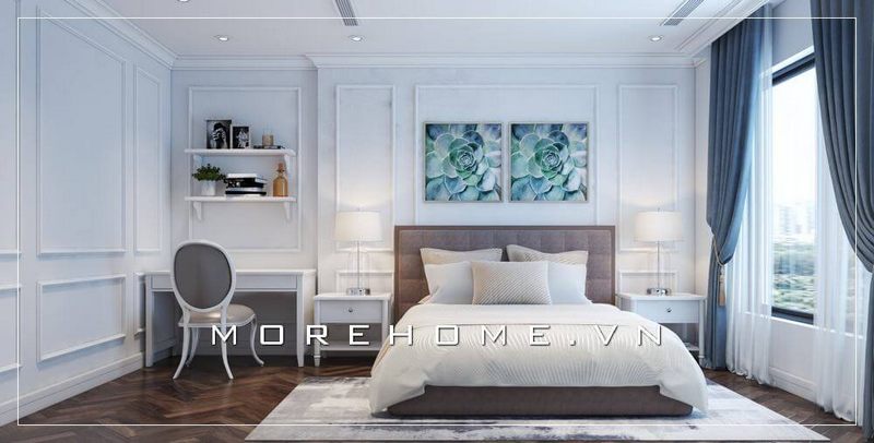 Giường ngủ biệt thự được thiết kế bằng chất liệu gỗ công nghiệp phun sơn trắng cao cấp, phần đầu giường được lựa chọn bọc nỉ nhung màu tối để tạo nên một điểm nhấn huyền bí và đẳng cấp hơn cho căn phòng.