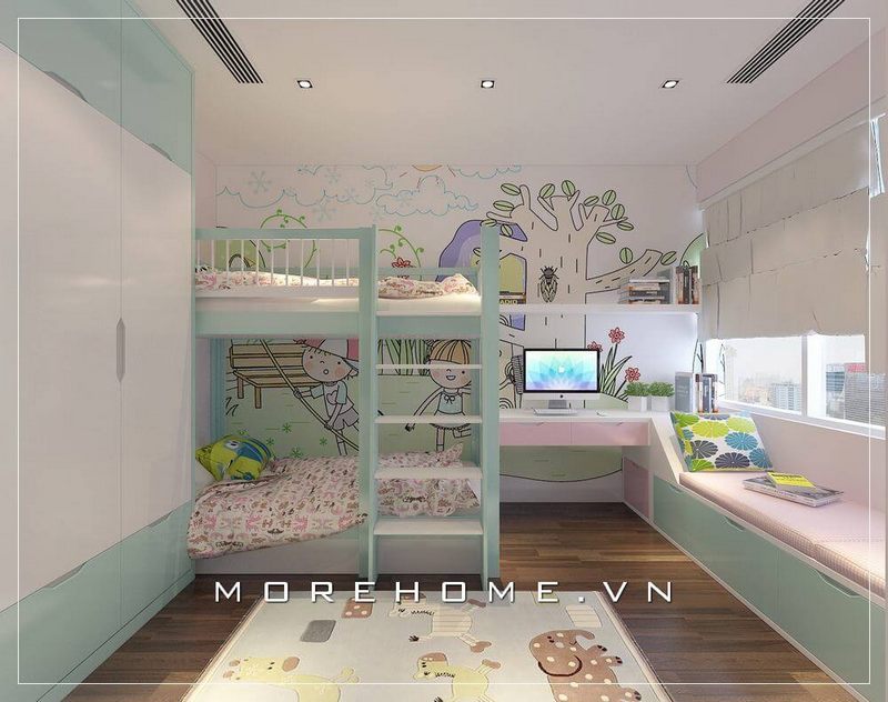 Để phù hợp với nhu cầu của gia đình có hai bé gái và diện tích nhỏ của căn hộ chung cư, một mẫu giường tầng sẽ là lựa chọn tốt nhất. Đây là một loại giường có thể tận dụng tối đa diện tích của phòng ngủ và cung cấp cho bé gái của bạn một không gian ngủ riêng.